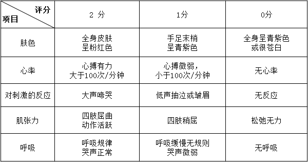 阿氏评分体系中,满分为10分,肤色、心率、对刺激的反应、肌张力和呼吸五个方面各占2分。